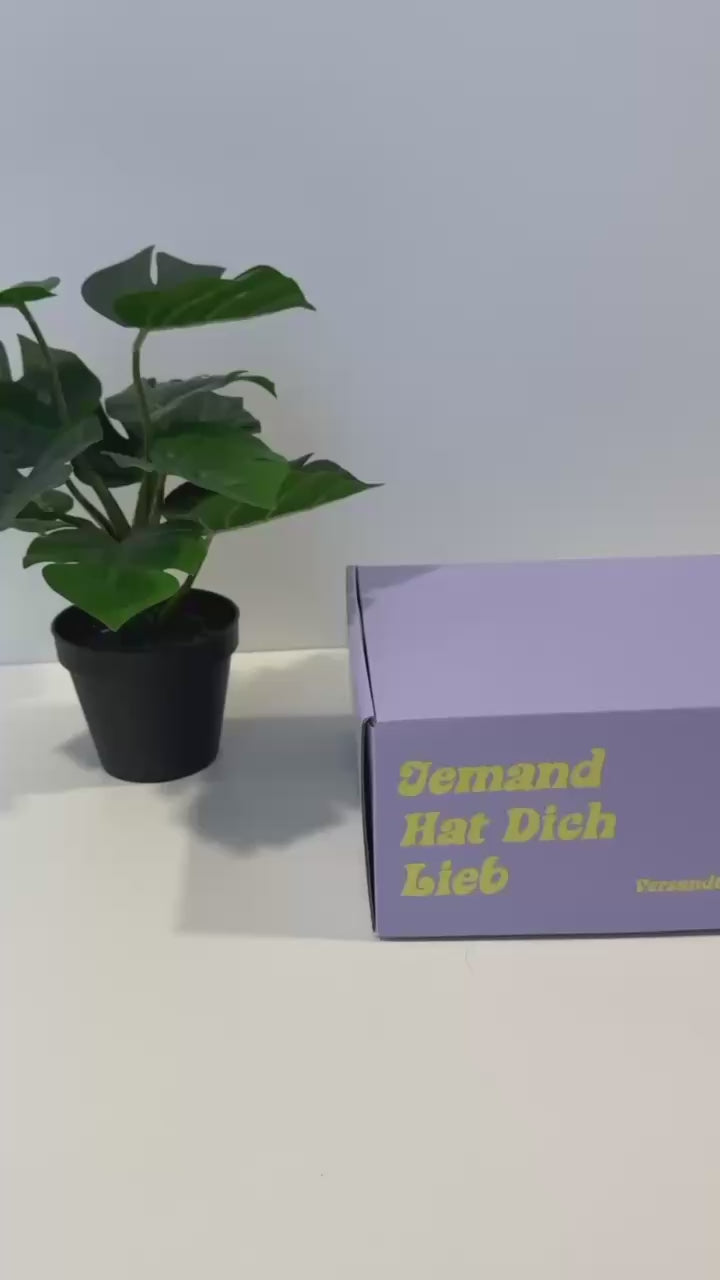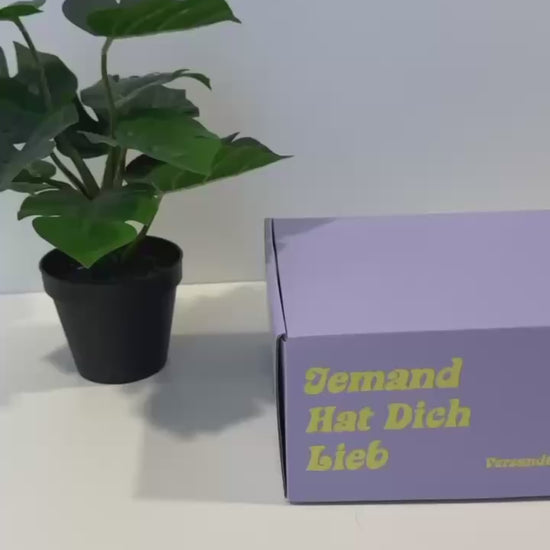 ✨ Der magische Moment beim Auspacken. Jedes Huugieme kommt in unserer einzigartigen Fliederfarben Box, mit gelber Aufschrift‚Jemand hat dich lieb‘.