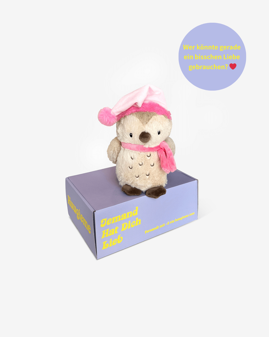 Huugieme ist ein Service mit dem du Kuscheltiere mit einer besonderen Notiz überall in Deutschland versenden kannst. Wähle ein Stofftier aus unserer Sammlung flauschiger Freundchen aus, wir fügen eine besondere Wertschätzende Notiz hinzu und liefern die Freude in unserer charakteristischen "Jemand Hat Dich Lieb"-Box aus.