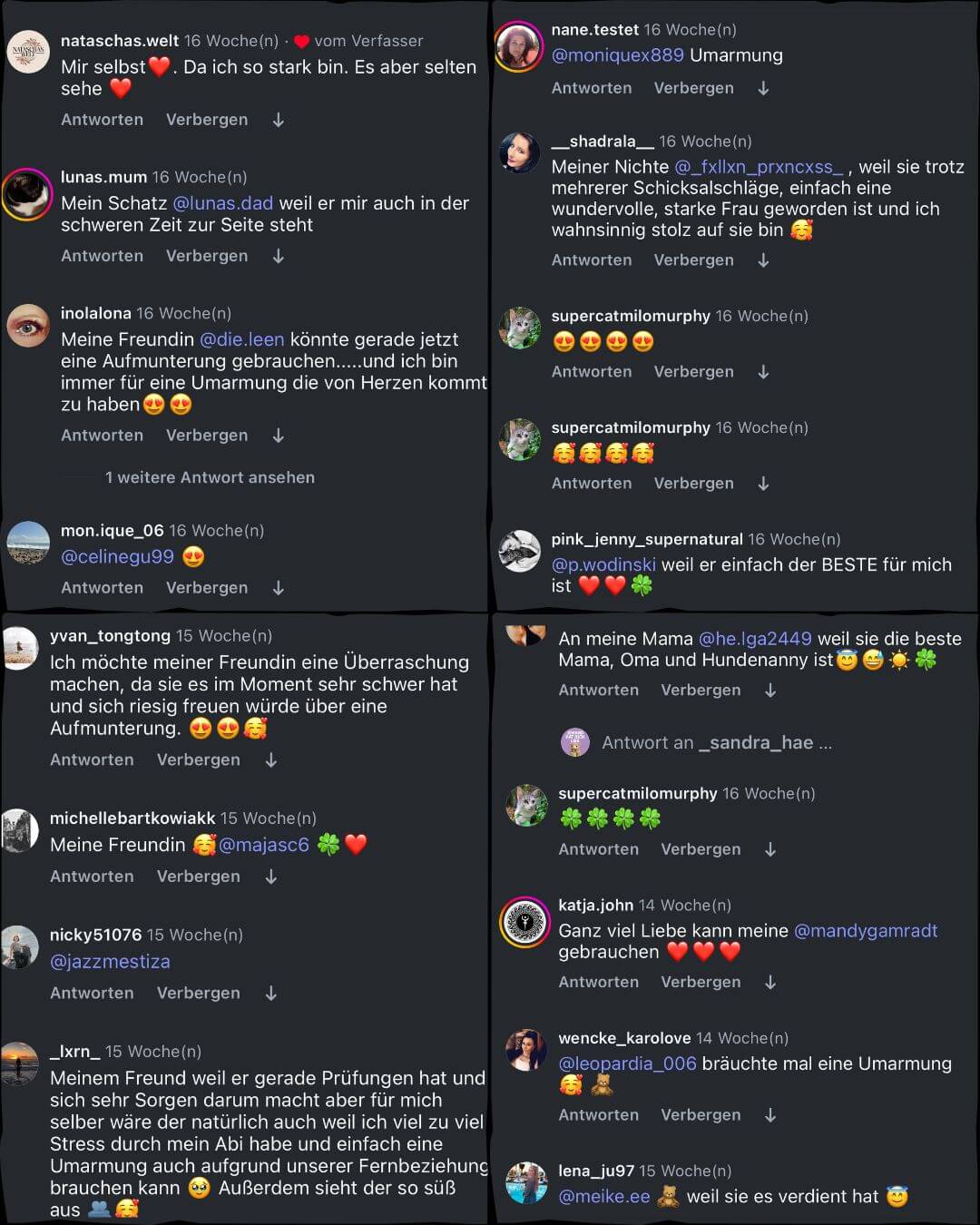 "Eine Umarmung ist für dich viel zu wenig. Ich weiß, dass wir uns immer aufeinander verlassen können. Danke dir und denke immer daran, dass du mich hast."