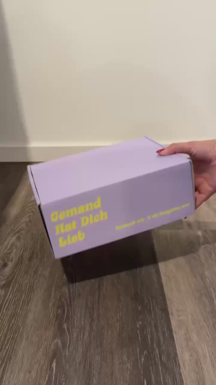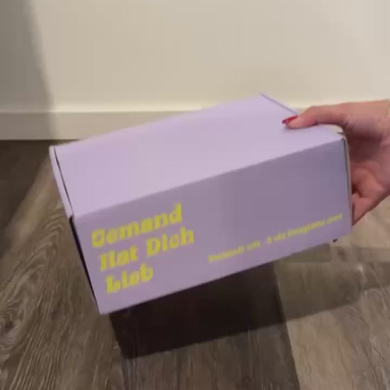✨ Der magische Moment beim Auspacken. Jedes Huugieme kommt in unserer einzigartigen Fliederfarben Box, mit gelber Aufschrift‚Jemand hat dich lieb‘.